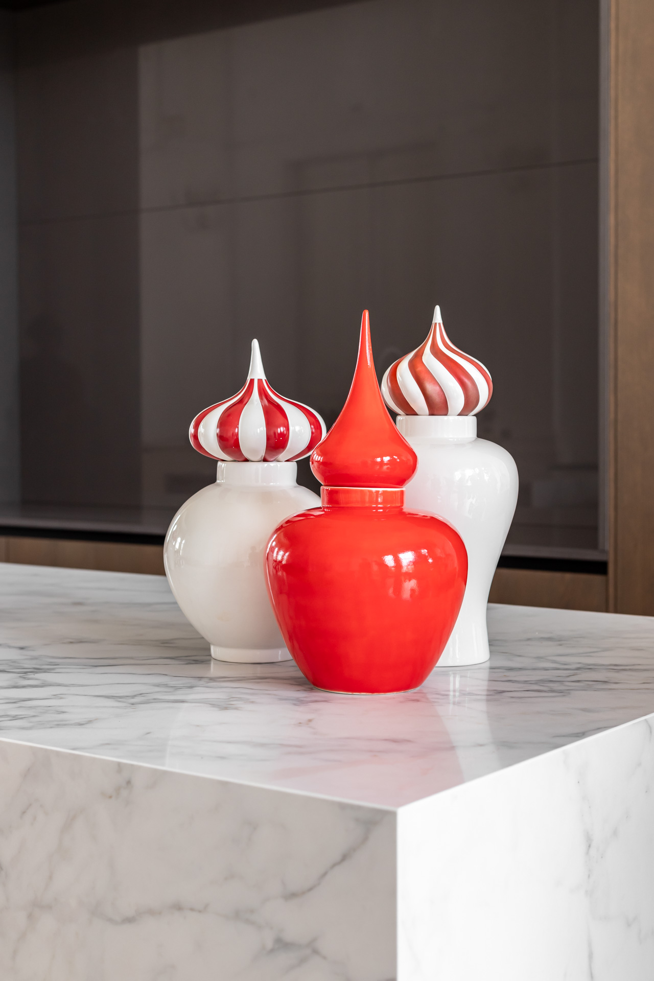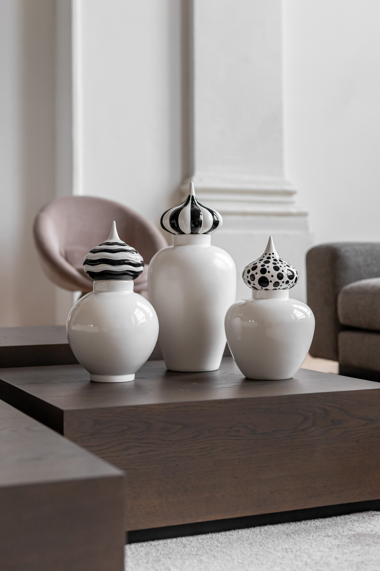 Особенность коллекции — модульная конструкция. Каждая ваза состоит из двух частей: основания и купола. Покупая несколько изделий, можно комбинировать детали между собой, создавая новые сочетания формы и цвета. Это позволяет «оживлять легенду» и адаптировать предмет под конкретное пространство.